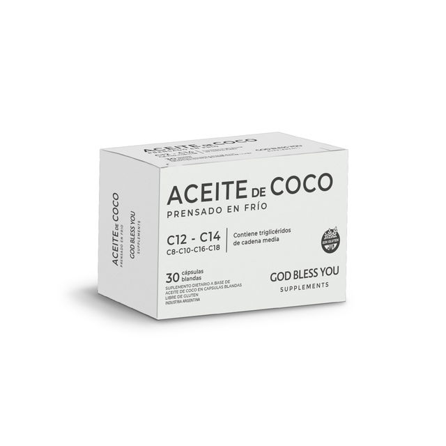 Aceite de coco prensado en frío (Virgen) en cápsulas blandas de rápida digestión.